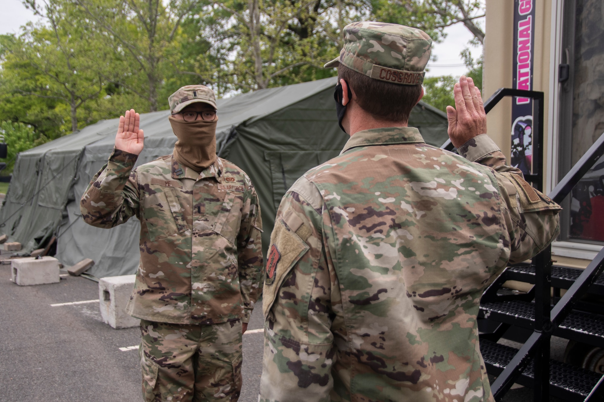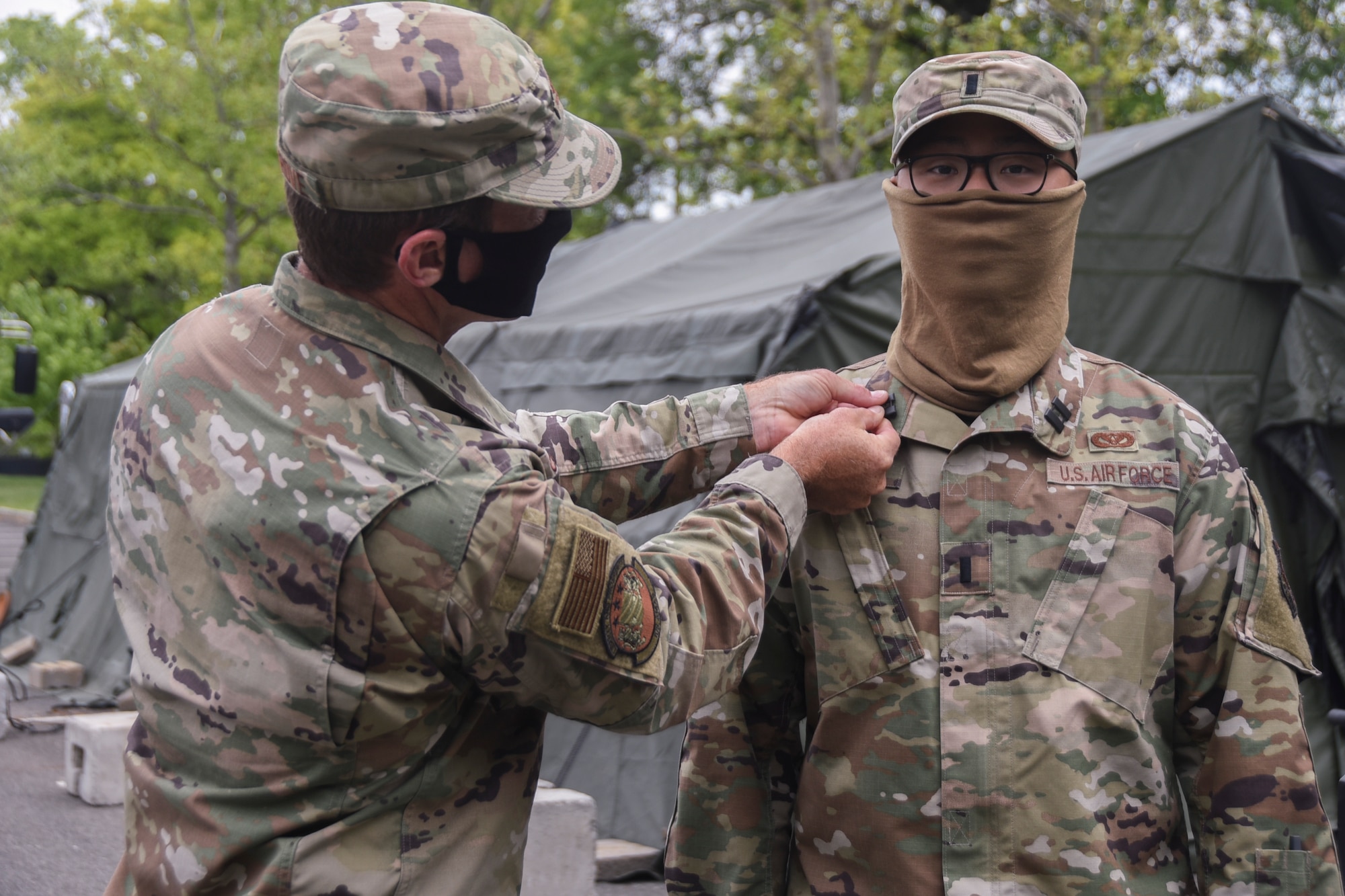 UNION, N.J. -- U.S. Air Force 1st Lt. Jiahua Ye, the 108th Civil Engineering Squadron environmental manager, was promoted to captain on May 18, 2020 and is currently serving as the officer in charge at the Union County COVID-19 testing site located at Kean University in Union, New Jersey.